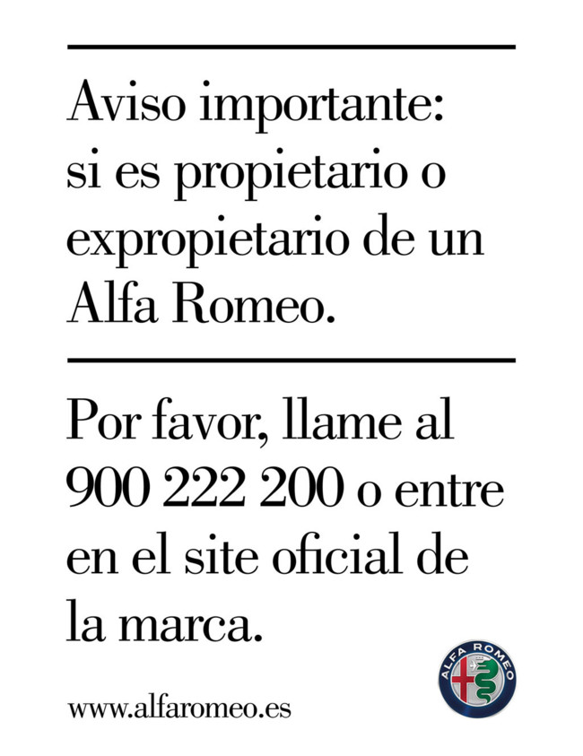 Así de agresiva es la campaña de marketing que la marca italiana ha puesto en marcha en España para dar a conocer la nueva berlina. Un llamamiento a través de la prensa escrita y digital para que los propietarios y ex-propietarios de coches Alfa Romeo se pongan en contacto con la marca a través del teléfono 900222200 o de la página web www.alfaromeo.es