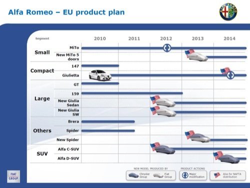 En el caso de Alfa-Romeo la novedad principal, ya anunciada, es el desembarco en Estados Unidos, donde comenzarán a vender modelos junto a Chrylser después de que el Grupo Fiat comprase el 20% de la marca en las rebajas de la crisis. A partir de 2010 aparecerán dos SUV que utilizarán plataformas de Chrysler, uno de los objetivos que Fiat tenía con la compra de su porcentaje.