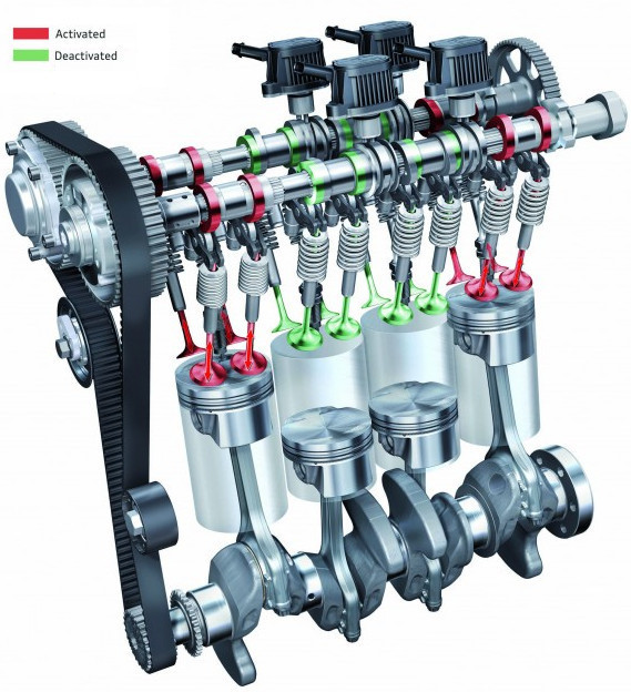 Como sabemos, en el motor 1.4 TFSI el COD desconecta los cilindros dos y tres, mientras que en el V8 4.0 TFSI se desconectan los cilindros números dos, tres, cinco y ocho. Las válvulas quedan cerradas por medio de unos pasadores accionados electromagnéticamente desde el árbol de levas. Así, las cámaras quedan llenas de aire fresco para reducir la presión interna en los cilindros.