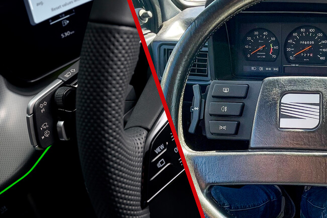 Audi no ha seguido la ruta de Tesla, con un par de botones mal situados en el volante, sino que ha reinterpretado de cierto modo el cuadro de controles del primer SEAT Ibiza, que llegó al mercado allá por 1984 con unos mandos de intermitentes, limpiaparabrisas y faros que no habría desentonado en los Citroën más añejos.
