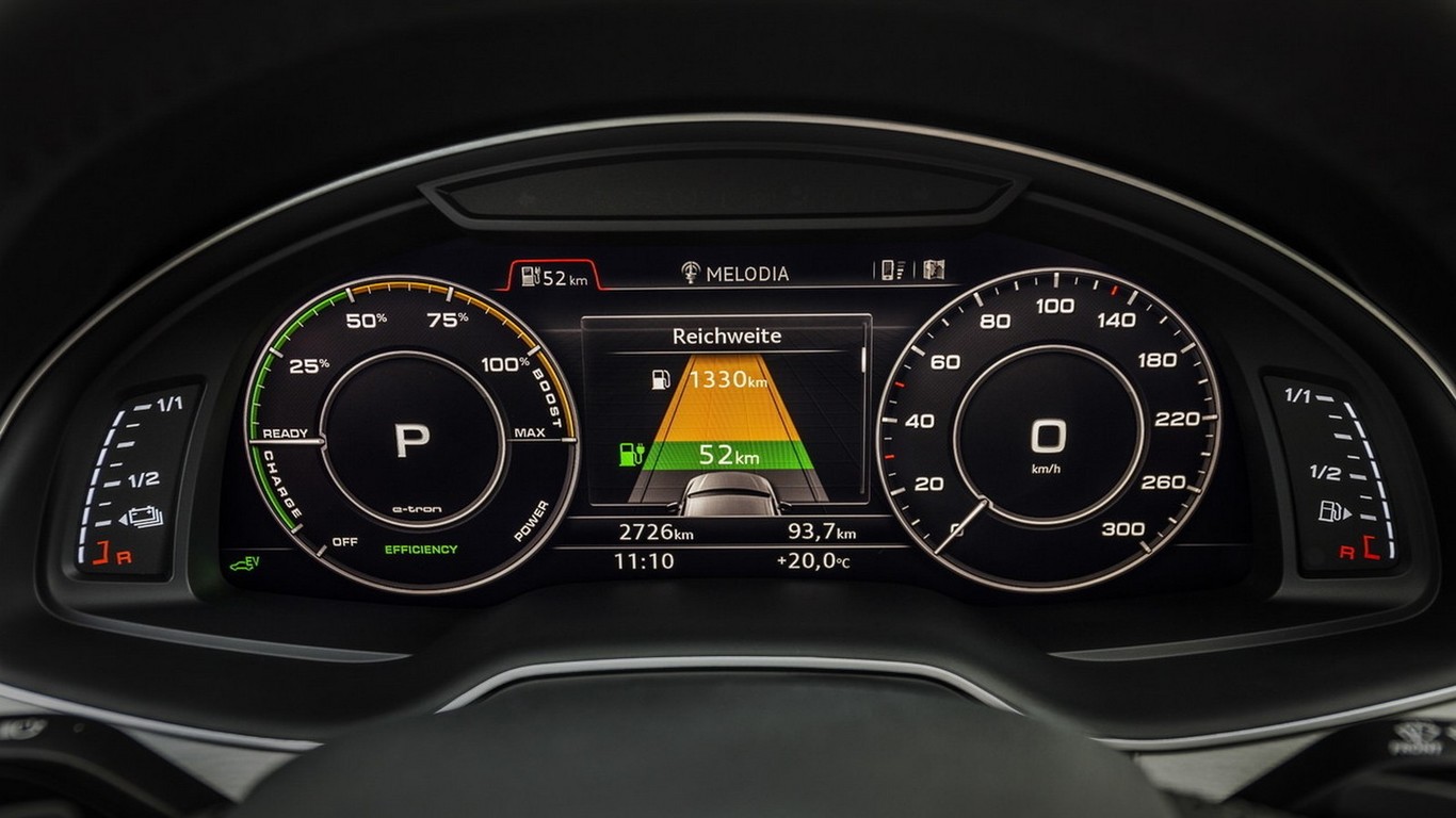 En el Audi Q7 e-tron ya se puede ver el consumo medio, la velocidad media y el tiempo que ha estado funcionando el motor de combustión a través de gráficos de ruta.