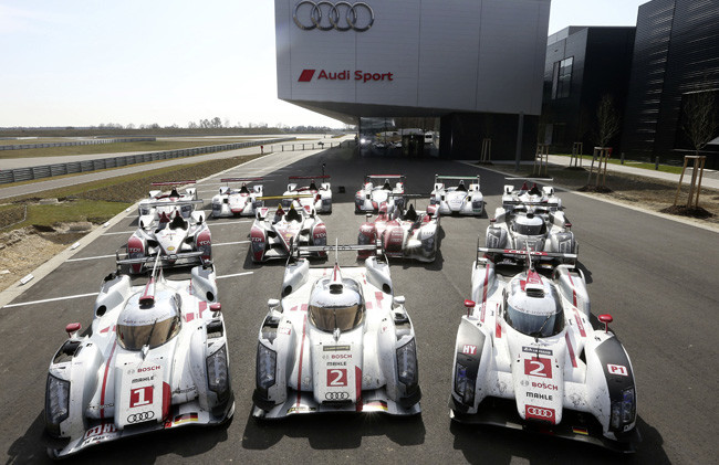 Con ánimo de calentar motores de cara a la próxima edición de Las 24 Horas de Le Mans, a mediados del mes que viene, Audi ha decidido reunir a todos sus coches campeones de la mítica cita francesa. Para la foto han posado los trece coches que han ganado la carrera en los últimos quince años, desde el primer Audi R8 hasta el último Audi R18 e-tron quattro.