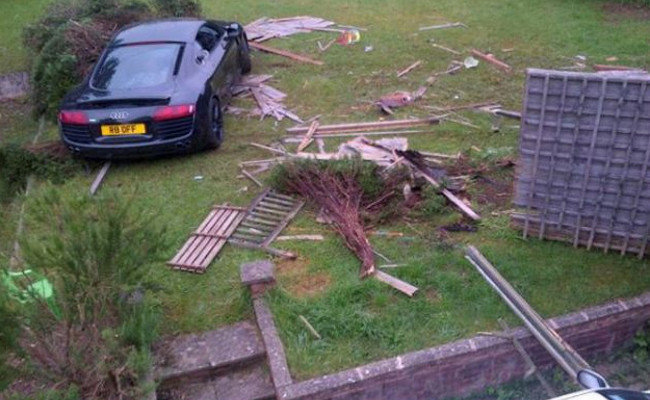 Y tierra adentro se metió. Se salió de la carretera arrasando 15 metros hasta dar con el jardín de una familia que se quedó como nos habríamos quedado cualquiera de nosotros. Total, que O’Brien tendrá que pagar los daños y le han dado 6 puntos del carnet de conducir (que en Reino Unido va al revés que aquí, allí sumas puntos cuando la lías, y si llegas a 12 en tres años te dan un premio).