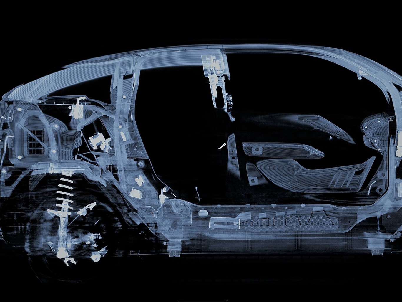 El proceso de tomografía computarizada se realiza por cuatro robots que pivotan alrededor del prototipo para producir miles de imágenes de secciones transversales. Trabajando en parejas, lanzan rayos X a través del vehículo y a sus contrapartes.