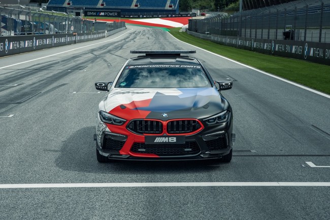 Desvelado en el circuito Red Bull Ring en el marco del Gran Premio de Styria (Austria), celebrado el pasado fin de semana, el BMW M8 Gran Coupé MotoGP Safety Car se diferencia a golpe de vista, más allá del atuendo de competición con los colores oficiales de la marca, por presumir de un frontal más agresivo.