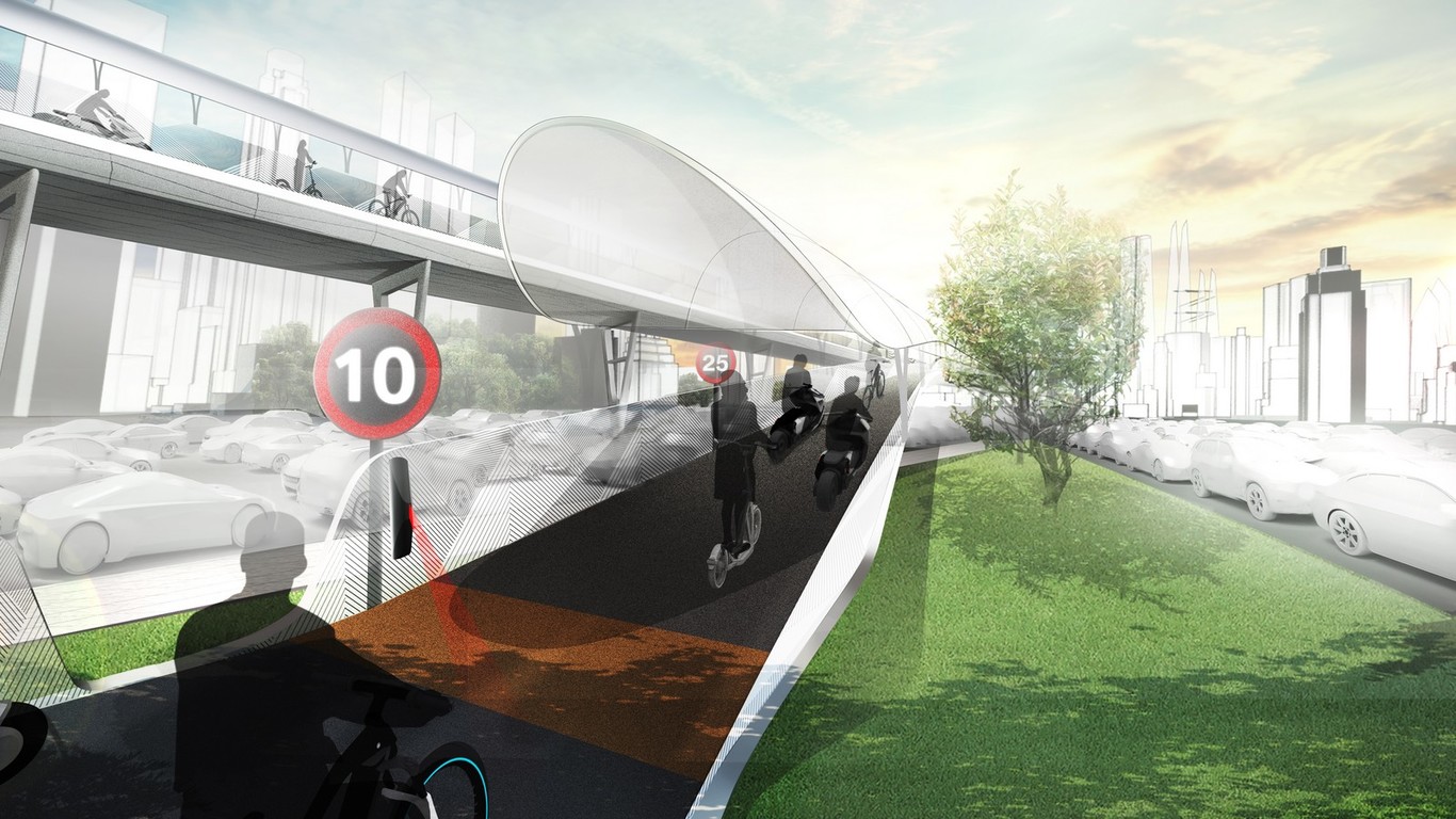 "La carretera elevada está cubierta en gran parte, lo que garantiza la protección contra la lluvia y el calor, así como una ventilación suficiente. Un sistema de enfriamiento con agua de lluvia purificada crea temperaturas agradables: también se puede usar para limpiar la superficie de la carretera durante la noche".
