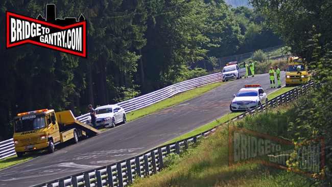 Nos cuentan en BridgeToGantry que ha sido por una pérdida de control, el M5 entró con mucho sobreviraje y la corrección no fue suficiente. Ha sido necesario cerrar el circuito y llamar a la grúa. Un pequeño mordisco para el seguro de la actividad, habida cuenta de los costes de golpe, grúa y cerrar el 'ring en consecuencia.
