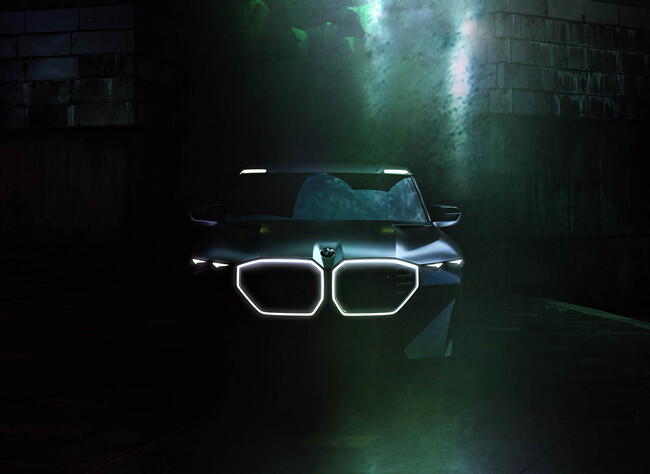 La imagen del XM difundida por BMW como teaser muestra un diseño especialmente macizo, anguloso y escultural. Esto incluye una calandra sobredimensionada cuyas imponentes dimensiones se ven acentuadas por la delgadez de los faros que la enmarcan.