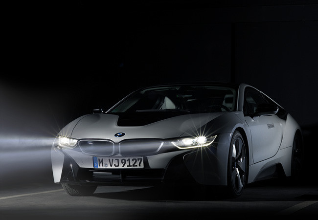 De serie, el BMW i8 cuenta con faros LED cuyo alcance de iluminación es de 300 metros. Las ventajas de la tecnología BMW Laserlight se centran en una intensidad lumínica diez veces superior a la de fuentes de luz convencionales, un consumo de energía 30 % menor y, dado que ocupa un reflector muy pequeño, permite que los diseñadores puedan jugar con la estética del coche.