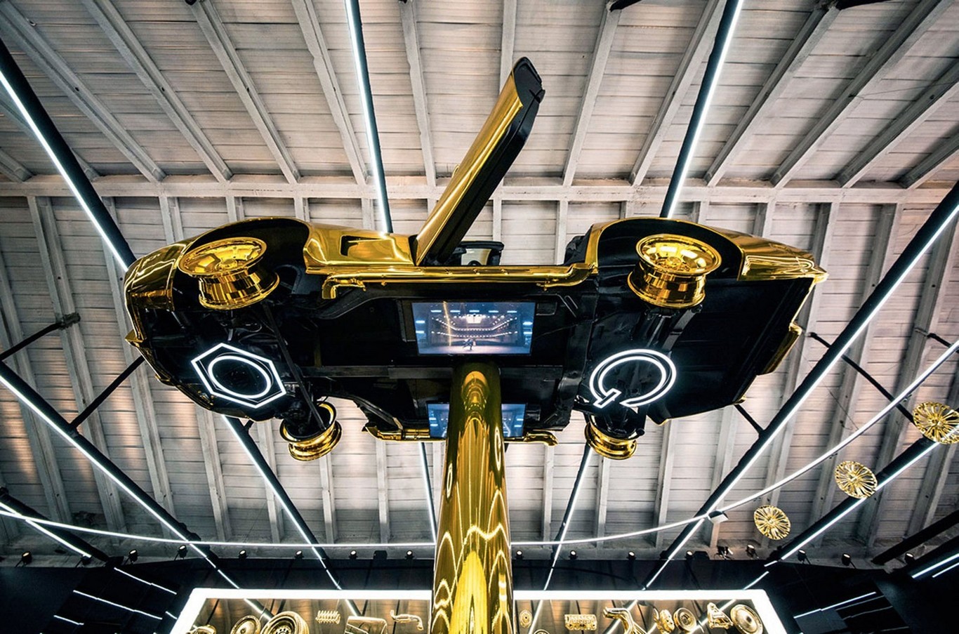 Para representarlo, montó un garaje en el corazón de Milán que bautizó como 'Cartier Precious Garage' y colocó un Corvette suspendido en el centro del 'taller mecánico' por el cual fluía ininterrumpidamente un líquido dorado que cubría el suelo y rodeaba la colección de joyas.