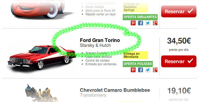 Ahora, que sin duda yo me quedo con el Gran Torino que amenizaba las noches de mi infancia. Equipado entre otras cosas con "capó para deslizar" y con "entrada por ventanas", lo raro es que no lo alquilaran ayer con "cubo de basura e hidrantes que saltan por los aires en plena persecución". Mención aparte merecen los "puros incluidos" en la GMC G-15 o la "plaza de garaje propia" del Batmóvil.