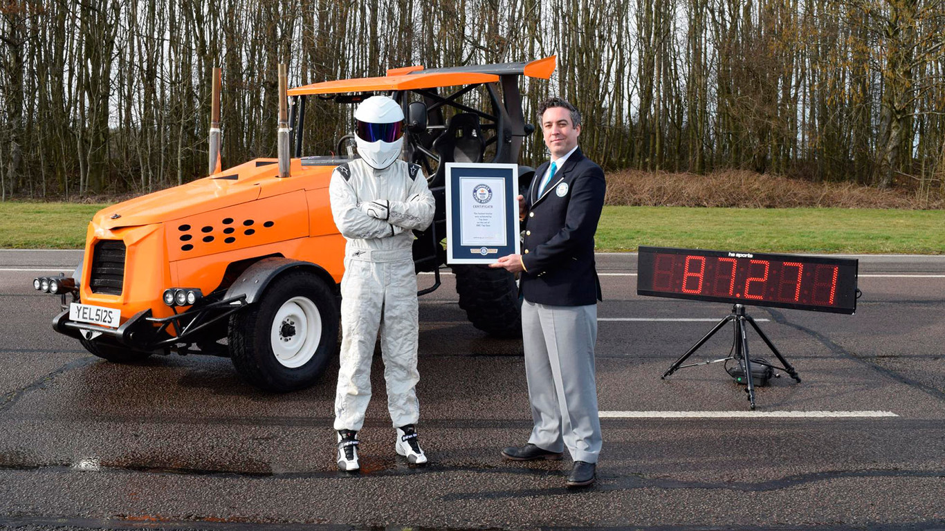 Con Jack Brockbank como testigo, uno de los muchos jueces oficiales del Récord Guinness, el emblemático piloto parapetado tras el casco conseguía una velocidad de 140,3 km (87,2 mph) ante el asombro de Brockbank. El Track-tor de Top Gear se convierte así en el tractor más rápido del mundo, quitándole el record al Valtra T234, un tractor finlandés que conseguía el título en 2015 tras alcanzar los 129,8 km/h.