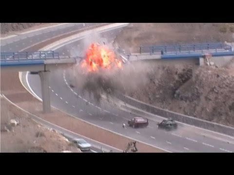 En un segundo vídeo podemos ver qué pretenden hacer con el tanque que va por la Autovía del Sur (un tramo cortado) en sentido contrario. Se supone que dispara al puente y afecta a la persecución de turno. La magia del cine puede hacernos creer que el puente de verdad ha sido hecho migas.