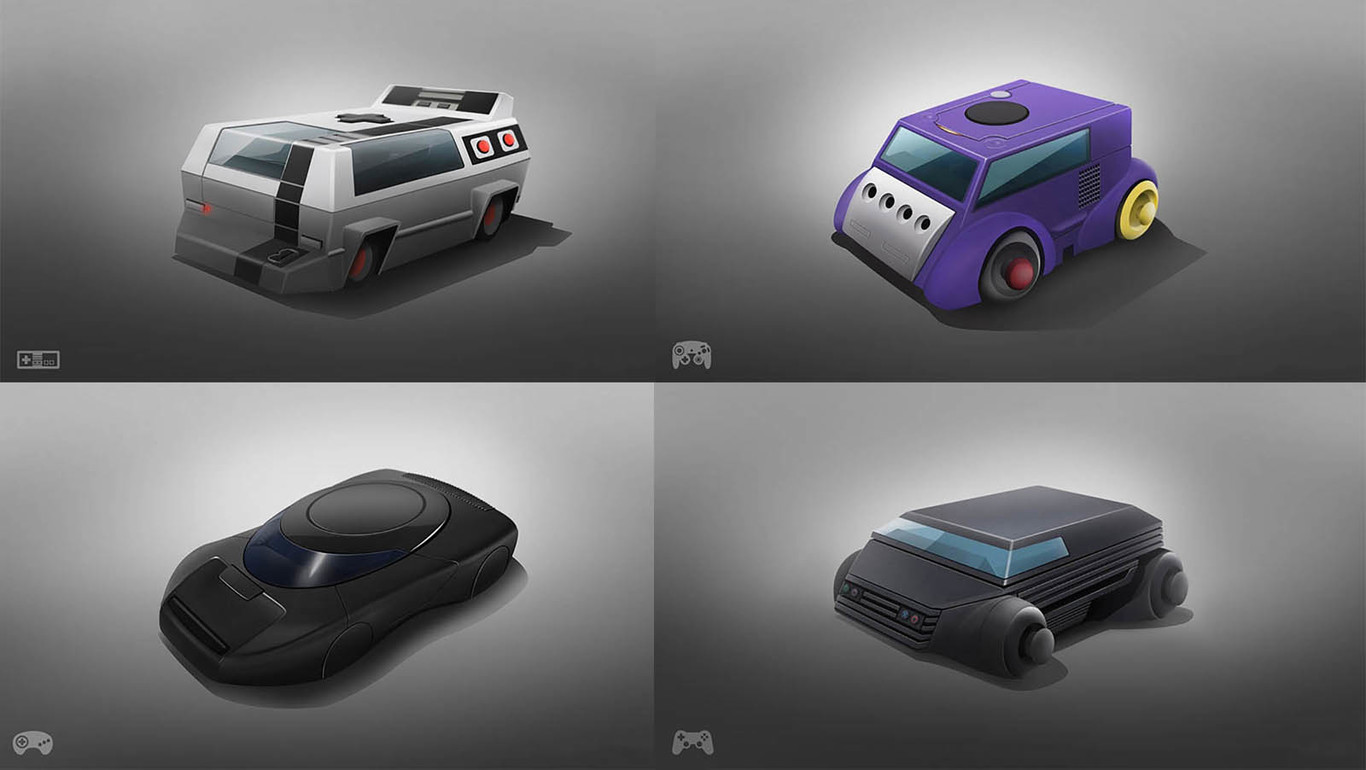 Cada consola, por su forma y lenguaje estético, recuerda algún tipo de automóvil: deportivo, familiar, etc. Este ejercicio de creatividad pretende nada más que sacarnos una sonrisa nostálgica viendo como una NES Nintendo se convierte en un depotivo monovolumen o una SEGA Megadrive en una suerte de esbelto y furtivo deportivo, mientras que la Atari 2600 sigue tremendamente retro, incluso transformada en coche.