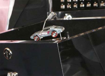 El modelo de la foto, recubierto de diamantes y rubies y con carrocería de oro blanco es una unidad especial diseñada por uno de los más prestigiosos joyeros de Beverly Hills con motivo del 40 aniversario de Hot Wheels. Por llevar, lleva hasta diamentes en el motor y en las ruedas.