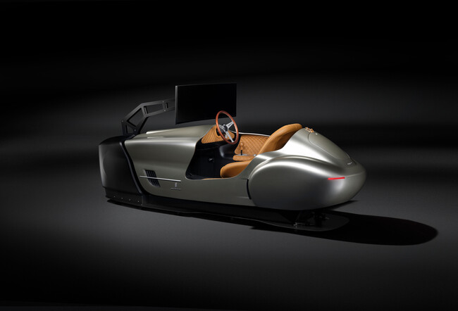 El asiento está realizado en cuero “Connolly”, y es del mismo color “Marrone Tobacco” que recubre la cabina del simulador. Por su parte, la estrecha carrocería está acabada en color “Argento Vivo”. Corona el conjunto la pantalla ancha y curva situada sobre el asiento del conductor, que pretende proporcionar al usuario una experiencia de simulación inmersiva.