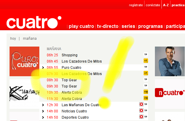 Si husmeamos en la programación de la cadena Cuatro del lunes 1 de agosto, comprobamos que de 08:30 a 10:30 hay dos episodios consecutivos de este show británico (porque supongo que se refieren a la versión británica) antes de que empiece Alerta Cobra. Vaya, nos quieren fusionar al televisor por las mañanas…