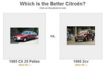Creo que había visto alguna página de este estilo pero con otra temática, la cuestión es que con ella pretenden determinar cual es el mejor modelo de Citroën de toda su historia en base a los votos de la gente. El mecanismo es fácil, aparecen dos modelos aleatorios y tu eliges el que más te gusta. Ojo, es bastante vicioso, los que estéis en la oficina recordad que también tenéis que trabajar un poco. Cuando os canséis de votar podéis ver los ganadores de la batalla.