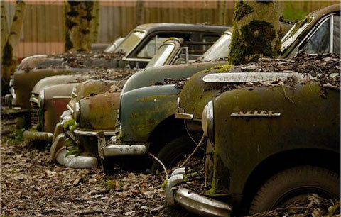 Impresionante a la vez que dolorosa imagen. Esos coches llevan aparcados ahí desde hace ya unos cuantos años, sin ser movidos ni molestados. Eran coches que se compraron entre los años ‘30 y ‘60 para pasar a formar parte del stock de piezas de un concesionario local, pero nunca fueron usados.