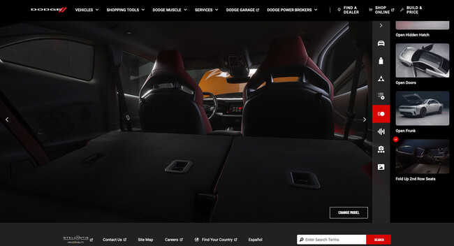 Dodge, de momento, sólo permite configurar la carrocería coupé de dos puertas (habrá una variante de cuatro puertas) en versión eléctrica y dos niveles de acabado: Scat Pack, y R/T. Como recordatorio, el Scat Pack desarrolla 670 CV y puede hacer 0-60 mph (96 km/h) en 3,3 segundos.