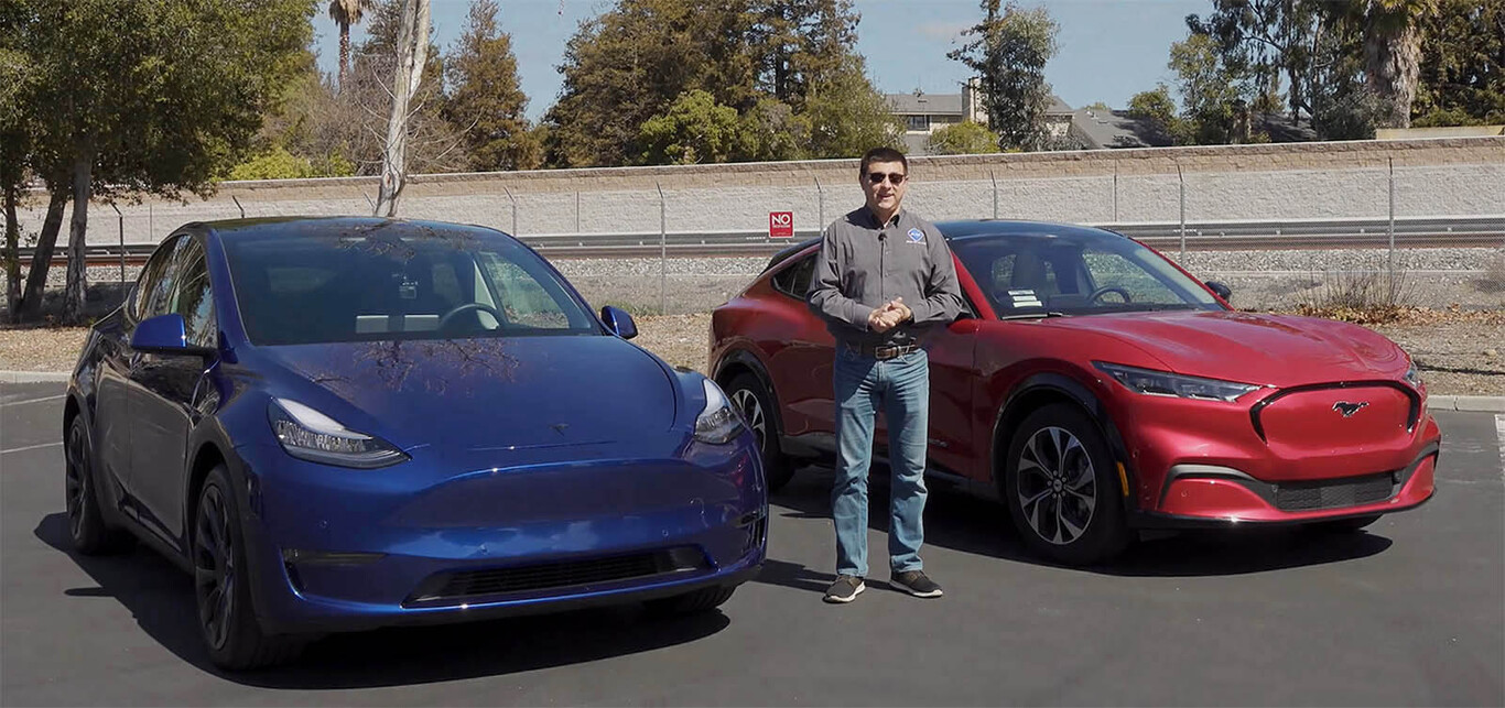 Las unidades que somete a prueba son, por una parte, un Ford Mustang Mach-E Extended Range AWD de 351 CV, por otra parte, el Tesla Model Y Long Range Dual Motor, de también 351 CV. El Mustang Mach-E equipa una batería de 88 kWh útiles (98,8 kWh brutos) y el Model Y cuenta con una batería de 78 kWh útiles (82 kWh brutos). La batería del Mach E ofrece una mayor capacidad y sin embargo su autonomía en ciclo EPA es de 435 km, mientras que el Model Y homologa 525 km, también en ciclo EPA y en ambos casos con llantas de 19 pulgadas.
