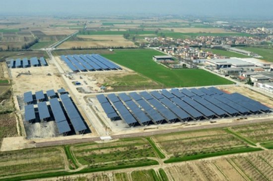 La empresa alemana Phoenix Solar AG ha construido uno de los estacionamientos solares más grandes del mundo, en Piadena, un pueblo al norte de Italia, no muy lejos de Milán (a una hora y media más o menos por carretera). En la cubierta de las marquesinas sobre las plazas de aparcamiento, ha instalado 24.700 paneles solares fotovoltaicos de silicio cristalino para generar energía eléctrica.
