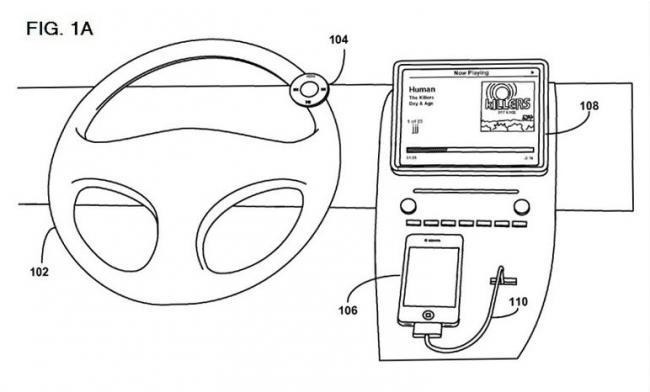 Basándose en la rueda de control de los primeros iPod, Apple muestra un controlador remoto, que se colocaría en los bordes del volante para no interferir en los procesos de apertura del airbag, desde el que poder controlar los cambios de emisoras, listas y canciones sin necesidad de apartar la vista de la carretera.