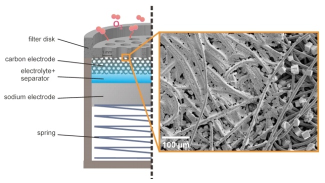 La celda básica de esta batería consiste en un ánodo de sodio metálico, un separador de fibra de vidrio y un cátodo de fibra de carbono que funciona como lámina de difusión de gas. El electrolito es una solución de sal de sodio en dietilenglicol dimetil éter.