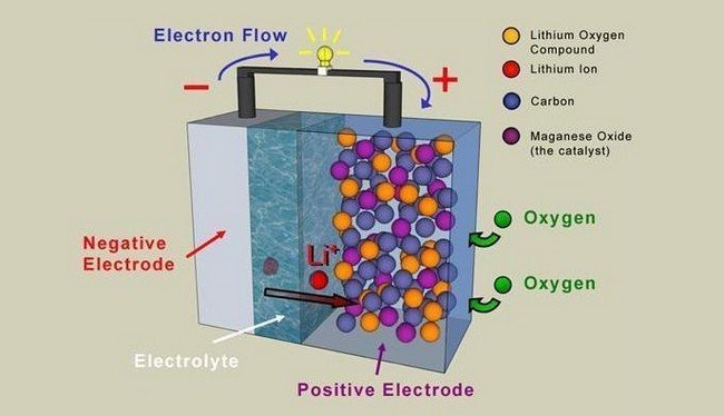 La tecnología Li-air se basa en un electrodo positivo formado por carbono a diferencia de las actuales baterías de litio ion que tienen óxidos metálicos. El caso es que el carbono del electrodo positivo reacciona con el oxígeno “ambiental” que lo rodea formando corrientes eléctricas. La ventaja de todo esto es que el electrodo positivo de carbono-oxígeno parece ser mucho más ligero que los actuales de óxidos metálicos.