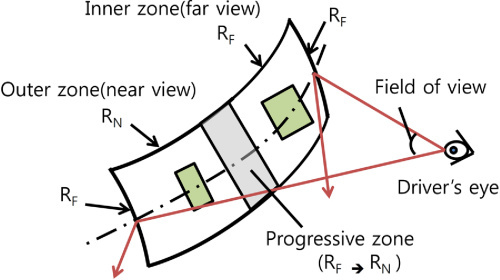 La idea de la lente progresiva nos deja con tres zonas de visión. Una zona más externa para ver los cuerpos que están cerca y anular los ángulos muertos, la zona más próxima a la puerta del conductor para ver los vehículos lejanos y por último una zona intermedia que hace de transición para que el paso de una a otra no sea muy brusco.