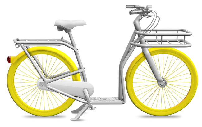 Con la intención de integrarla en un sistema público de alquiler de bicis, han encargado al diseñador Philippe Starck y a Peugeot, el desarrollo del híbrido entre bicicleta y scooter que tenéis sobre estas líneas, prototipo conocido hasta el momento como City PIBAL.
