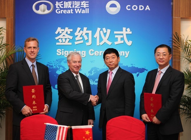 Los responsables de Coda Automotive, a quienes vemos en esta foto al firmar hace un año un contrato con Great Wall Motors Company para colaborar en el desarrollo de coches eléctricos, han decidido abandonar definitivamente la fabricación de vehículos y en el futuro se dedicarán exclusivamente al almacenamiento de energía. Para acometer esta reorientación, Coda se ha acogido a un plan de quiebra que le permitirá vender y refinanciarse en cuestión de 45 días.