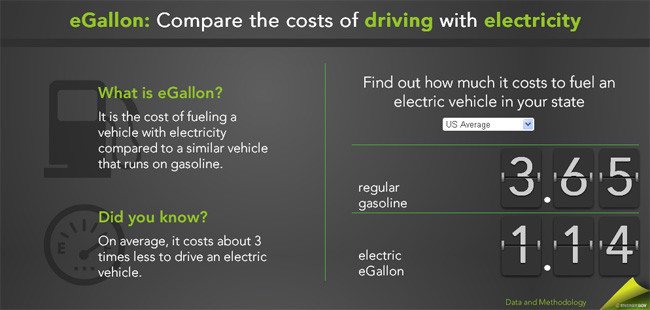 Para calcular su eGallon se basan en lo siguiente: toman la distancia que es capaz de proporcionar un galón de gasolina (3,7854 litros) según la media para este tipo de vehículos en 2012, es decir 45,385 kilómetros; para después calcular cuál es el coste medio de la electricidad que consume un vehículo eléctrico para recorrer la misma distancia. La proporción resultante, 3 veces más cara la gasolina, no ha dejado de generar cierta polémica y animar el debate de las comparaciones en Estados Unidos.