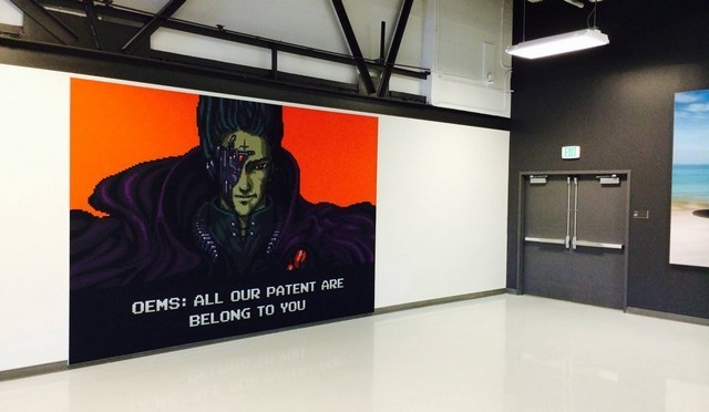 Ahora esa pared ha sido modificada, en su lugar aparece un enorme cuadro, de dudoso gusto, a favor del movimiento de código abierto para el avance de la tecnología de los vehículos eléctricos y en el que se puede leer la siguiente frase: