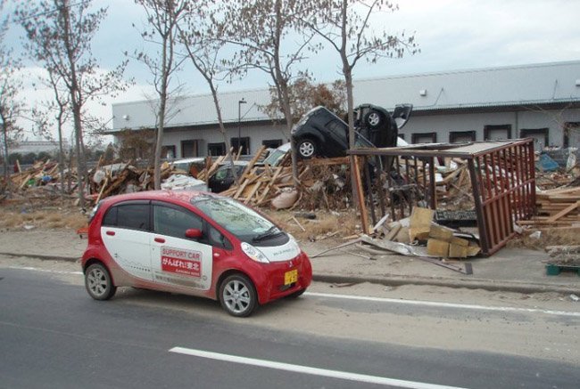 Ante la practica destrucción de la red de distribución de combustibles, el fabricante japonés Mitsubishi ha decidido enviar una flota de 89 unidades del eléctrico Miev para ofrecer una solución de movilidad tanto a los equipos de rescate, equipos médicos, a los cientos de voluntarios y también a los muchos desplazados que ya no disponen de medios de transporte, públicos o privados