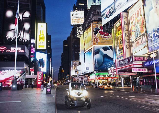 Pocos coches han llamado tanto la atención en las calles de Nueva York como el más pequeño de la gama ZE de Renault, el Twizy, que a pesar de que no está prevista su llegada al mercado norteamericano, el fabricante francés ha querido dar un impulso a su campaña publicitaria paseando al eléctrico por las calles de la gran manzana.