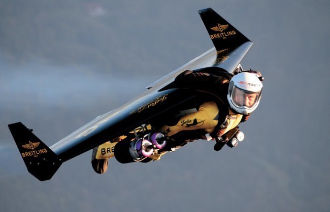 Este valiente de nacionalidad suiza, ha desarrollado un ingenio construido en fibra de carbono, de dos metros de ancho de ala y solamente 55 kilos de peso, que vuela impulsado por cuatro motores a reacción, perfectamente alineados para evitar quemar al piloto, y que están alimentados por queroseno.
