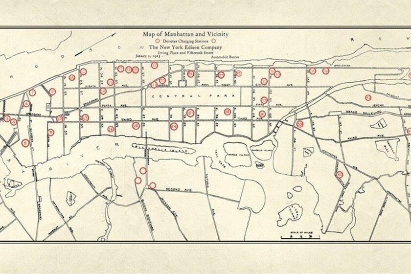 Pues en EEUU se pusieron manos a la obra con una completa red de recarga para los vehículos de la época. De ahí el sentido de este mapa los puntos de recarga de Manhattan a 1 de enero de 1923.
