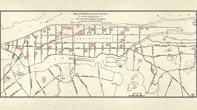 Pues en EEUU se pusieron manos a la obra con una completa red de recarga para los vehículos de la época. De ahí el sentido de este mapa los puntos de recarga de Manhattan a 1 de enero de 1923.