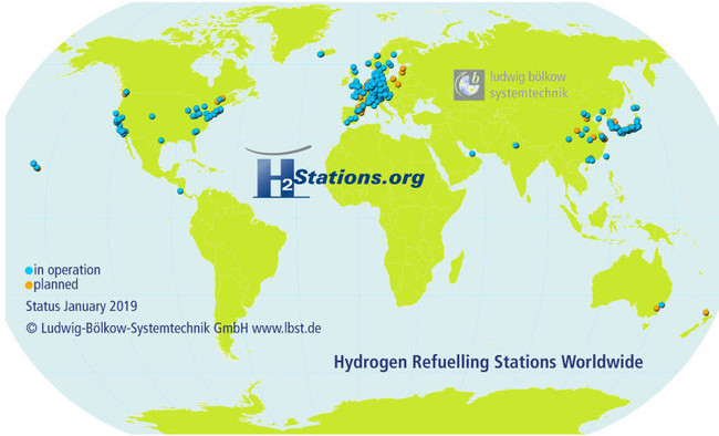 En todo el mundo hay 369 estaciones de hidrógeno, de las cuales 273 son de acceso público y pueden usarse como cualquier estación minorista convencional, mientras que el resto se dirigen a grupos de usuarios que suministran, por ejemplo, autobuses o clientes de flotas.