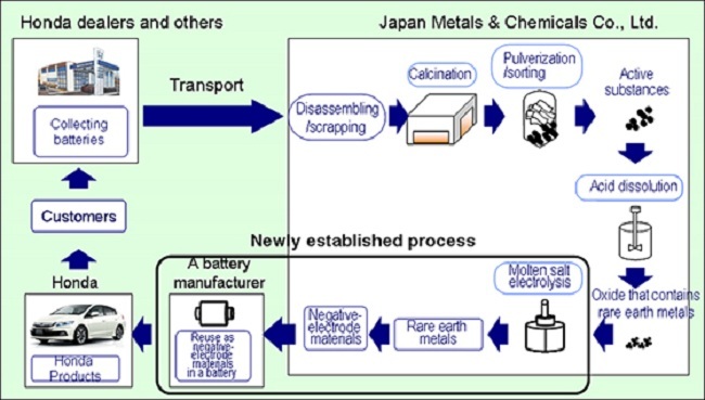 El reciclaje de las baterías sigue siendo un tema candente en cuanto a la sostenibilidad de los coches eléctricos. El uso de tierras raras y la posible contaminación que generarían las baterías en caso de ser arrojadas sin control al medio ambiente. Por ello, Honda está trabajando junto con Japan Metals & Chemicals Co. en un nuevo proceso de reciclaje de las baterías de Niquel-Metal-Hidruro para extraer las tierras raras de las baterías usadas.