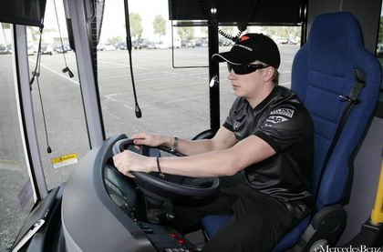 Aprovechando el Gran Premio de Australia de este fin de semana Mercedes ha decidido promocionar un autobús de pila de combustible sin emisiones contaminantes que se utiliza para dar paseos VIP por el circuíto de Melbourne. A este hombre ni conduciendo un autobús le cambia la expresión, empiezo a ver justificado lo de Iceman. Por cierto, en eMercedesBenz no aguantaron sin contar que mientras Kimi probaba el autobús apareció Christian Klien con un autobús de Red Bull Racing y le rompió el eje trasero…