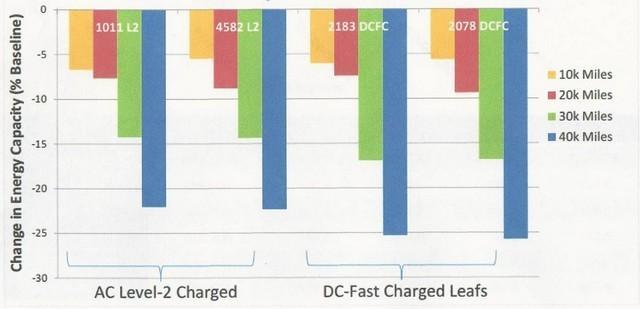 Los resultados que se obtuvieron demostraron que la degradación de la capacidad de la batería era similar en los cuatro coches a las 10.000 millas, 16.093 km,, en torno a un 6%. A las 30.000 millas, 48.280 km, la degradación de las baterías de los coches cargados de forma lenta era del 14% mientras que las de los otros dos coches, cargados de forma rápida era un 3% más alta, del 17%.