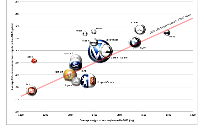 En valores absolutos, Fiat es el fabricante de menores emisiones, con 118,4 g/km, pero apenas ha mejorado respecto a los resultados de 2011. Está especializado en coches pequeños (por lo tanto más ligeros) y de bajo consumo. Aún no han cumplido el objetivo de 2015 aplicando el factor corrector a los coches que venden, pero por muy poco.