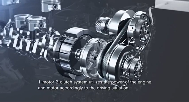Este sistema permite igualmente que funcionen los dos motores a la vez para tener máxima potencia, o bien desacoplar el motor térmico y funcionar solo con el motor eléctrico, el cual también recupera energía en las retenciones.