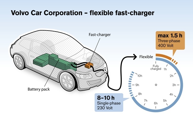 En la flota de vehículos eléctricos de prueba o leasing de Volvo, por ejemplo con unidades de Volvo C30 eléctrico, se pueden recargar las baterías para recuperar 80 km de autonomía con solo media hora. El cargador es compacto y se puede integrar sin problemas dentro del coche.