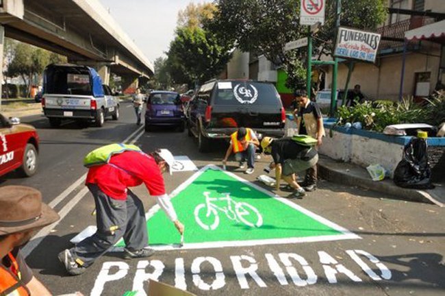 Cansados de las esperas y las promesas incumplidas, los ciclistas de la ciudad de México han pasado a la acción y se han puesto a pintar con sus propias manos unas indicaciones de prioridad para las bicicletas, en una ciudad que necesita de forma urgente una reducción de tráfico rodado.