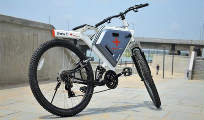 Razón no le falta, pues con una bicicleta con pedaleo asistido como la Cross X se puede, a menudo, viajar a mayor velocidad entre el denso tráfico de la ciudad, e incluso acortar el trayecto superando los desniveles subiendo o bajando escaleras, o circulando, si es preciso, por las aceras. Esta bicicleta, diseñada por Mithun Darji, y pensando en que podría ser útil a la Cruz Roja, ha sido capaz de ganar un premio en el Red Dot Concept Design 2013.