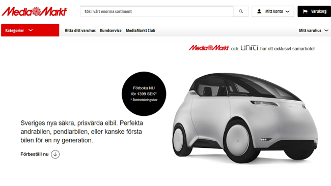 Uniti es un nuevo coche eléctrico que se vende en los Media Markt de Suecia, concretamente en dos: Malmö y Estocolmo. Con precios desde 14.660 euros (145.000 coronas suecas, en realidad), este smartphone car, como lo etiquetan sus creadores, se ha desarrollado en el país escandinavo y acaba de ser presentado en sociedad.