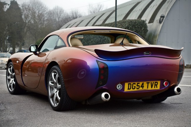 Sin paragolpes a la vista los faros se integran en la zona baja y la placa de matrícula es lo único que rompe las formas redondeadas. Los colores llamativos seña de identidad de TVR llegan a su clímax con una pintura iridiscente que cambia de color según la incidencia de la luz.